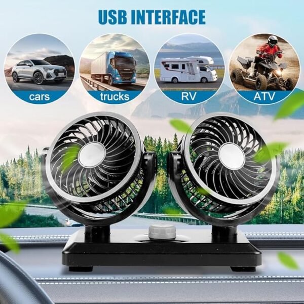 Ventilador para coche de doble cabeza con conexión USB diseñado para proporcionar una ventilación potente y ajustable en ambos lados su doble cabezal giratorio permite dirigir el flujo de aire en diferentes direcciones mejorando la circulación dentro del vehículo ideal para días calurosos y viajes largos su diseño compacto y silencioso garantiza comodidad sin distracciones compatible con la mayoría de coches y fácil de instalar en el tablero o reposacabezas